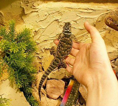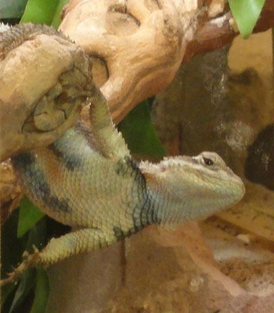 Nachzucht:Paarungszeit ist im Herbst (ab August); die Tiere sind lebendgebärend (etwa zwischen Januar und Mai); Anzahl Junge 6-16 (auch schon mal bis zu 26)Futter:hauptsächlich Insekten unterschiedlichster Art, ergänzend nehmen sie auch pflanzliches Futter an.Sonstiges: Der blaue Stachelleguan ist der größte bekannte Stachelleguan. Er zählt auch mit zu den am häufigsten gehaltenen Stachelleguanen. Blaue Stachelleguane können in Gruppen von einem Männchen mit mehreren Weibchen gehalten werden. Anmerkung: Niemals ausgewachsene Männchen in einem Terrarium zusammen halten. Das geht nicht gut. Auch unter den Weibchen kann es Ärger geben. In diesem Fall sollten diese ebenfalls getrennt gehalten werden, denn das unterdrückte Tier würde auf Dauer eingehen. Die Tiere haben einen starken Fluchtinstinkt und lassen sich nicht freiwillig anfassen. Sie werden aber ansonsten relativ schnell zutraulich und nehmen Futter auch aus der Hand.